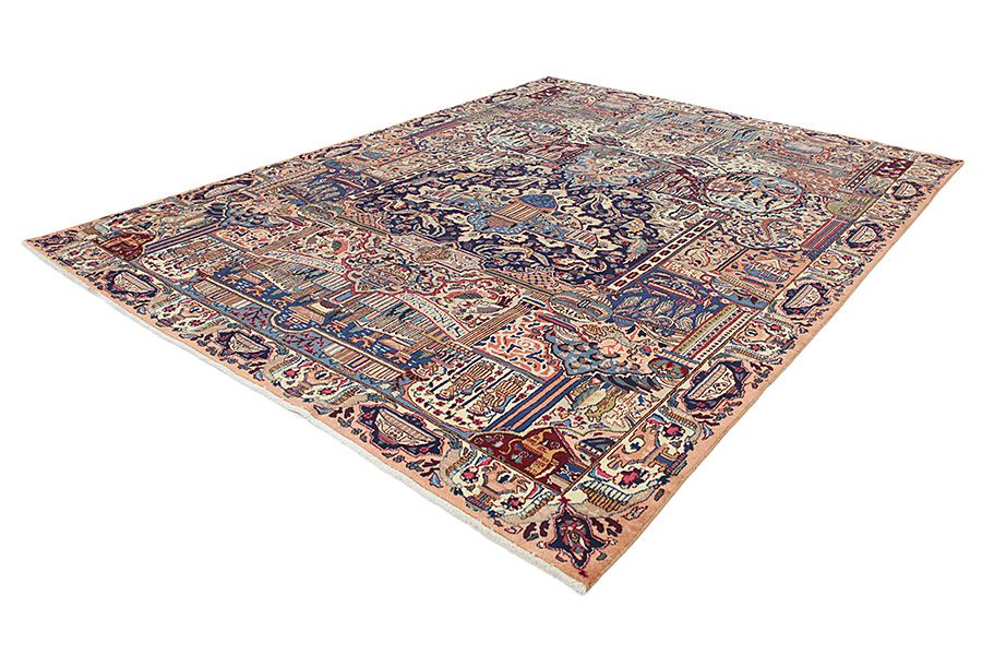 Die Stadt Kashmar liegt in der Provinz Khorasan, südwestlich der Stadt Mashad in Ost-Iran. Sie hat eine bedeutsame historische Vergangenheit und ihr alter Name ist Torshiz. Dort werden seit Jahrhunderten hervorragende, hochwertige Teppiche gefertigt. Diese Teppiche sind dicht und aus dünner weicher Wolle, in hübschen hellblauen Tönen, die einen guten Kontrast zu den Creme- und Elfenbeinfarbtönen bilden. Für die neueren Teppiche wird ein zartes Grün, Rot und Braun verwendet. Typisch für Kashmar Teppiche sind die großen Maße und ihre einzigartigen Muster, die Gemälden mit Bäumen, Blumen und Minarettenkuppeln gleichen. Außerdem sind Darstellungen abgebildet, die historische Ereignisse erzählen (wie z.B. ein wichtiges Ereignis aus der Geschichte Persiens oder einer bekannten historischen Person, oder die Geschichte eines ehrenhaften persischen Königs). In Kashmar werden hübsche, kunstvolle Meisterwerke mit Farbharmonie und mit komplexen, detailreichen Mustern gefertigt, die die Liebe der Perser für die Schönheit und für die Kunst zeigen. Die Kashmar-Teppiche sind robust und je älter sie werden, desto schöner werden sie.
