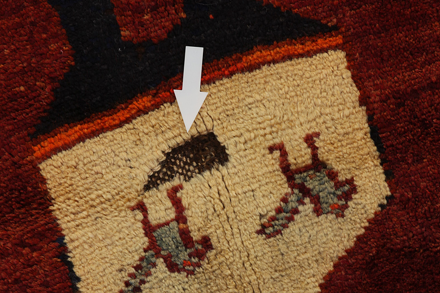 Die Farbe des Teppichs ist an einer kleinen Stelle des Flors verbleicht.