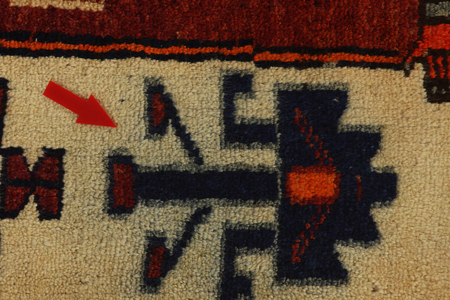 Abrash: Auf Grund des unterschiedlichen Wollfettgehalts und der unterschiedlichen Salzmenge während des Färbungsprozesses, hat die Wolle eine unterschiedliche Farbaufsaugfähigkeit. Vor dem Weben ist es nicht so sichtbar. Aber beim Weben entstehen Reihen mit unterschiedlichen Farbabstufungen der gleichen Farbe. Dies heißt Abrash und verdeutlicht die Natürlichkeit und die Originalität der Wolle, die mit keinen chemischen Mitteln behandelt wurde. Beispiele