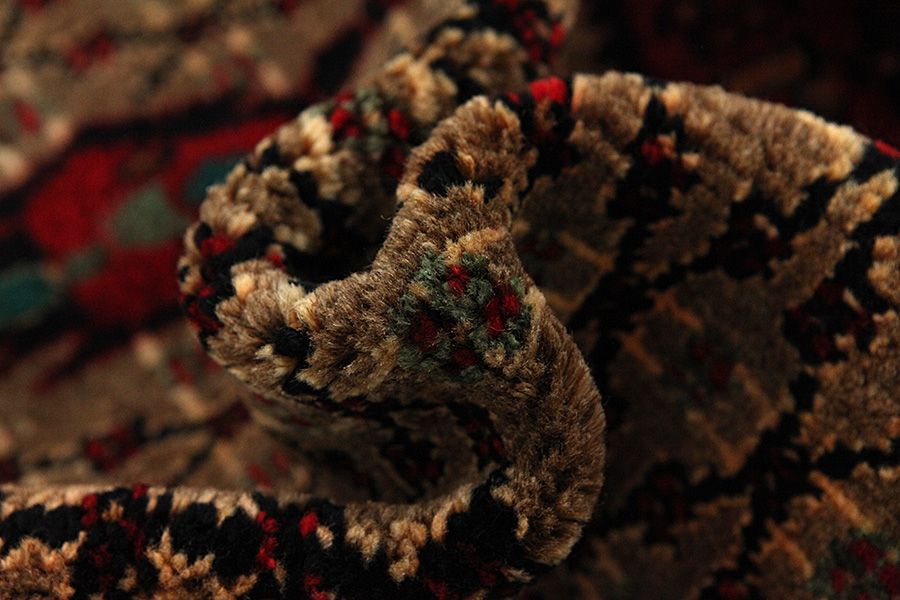 Abrash: Auf Grund des unterschiedlichen Wollfettgehalts und der unterschiedlichen Salzmenge während des Färbungsprozesses, hat die Wolle eine unterschiedliche Farbaufsaugfähigkeit. Vor dem Weben ist es nicht so sichtbar. Aber beim Weben entstehen Reihen mit unterschiedlichen Farbabstufungen der gleichen Farbe. Dies heißt Abrash und verdeutlicht die Natürlichkeit und die Originalität der Wolle, die mit keinen chemischen Mitteln behandelt wurde. Beispiele