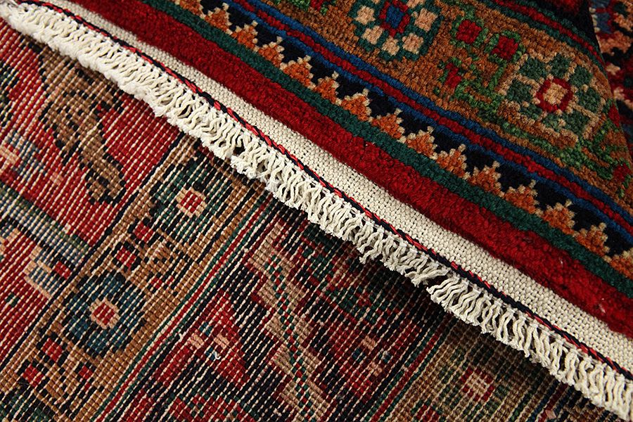 Abrash: Auf Grund des unterschiedlichen Wollfettgehalts und der unterschiedlichen Salzmenge während des Färbungsprozesses, hat die Wolle eine unterschiedliche Farbaufsaugfähigkeit. Vor dem Weben ist es nicht so sichtbar. Aber beim Weben entstehen Reihen mit unterschiedlichen Farbabstufungen der gleichen Farbe. Dies heißt Abrash und verdeutlicht die Natürlichkeit und die Originalität der Wolle, die mit keinen chemischen Mitteln behandelt wurde. Beispiele